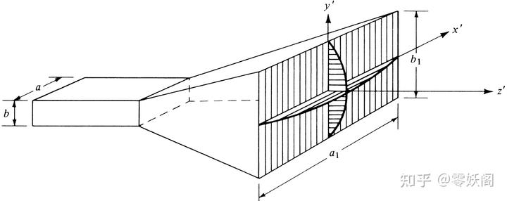 角錐喇叭天線是由矩形波導同時在兩個方向上按照一定角度張開而成的。